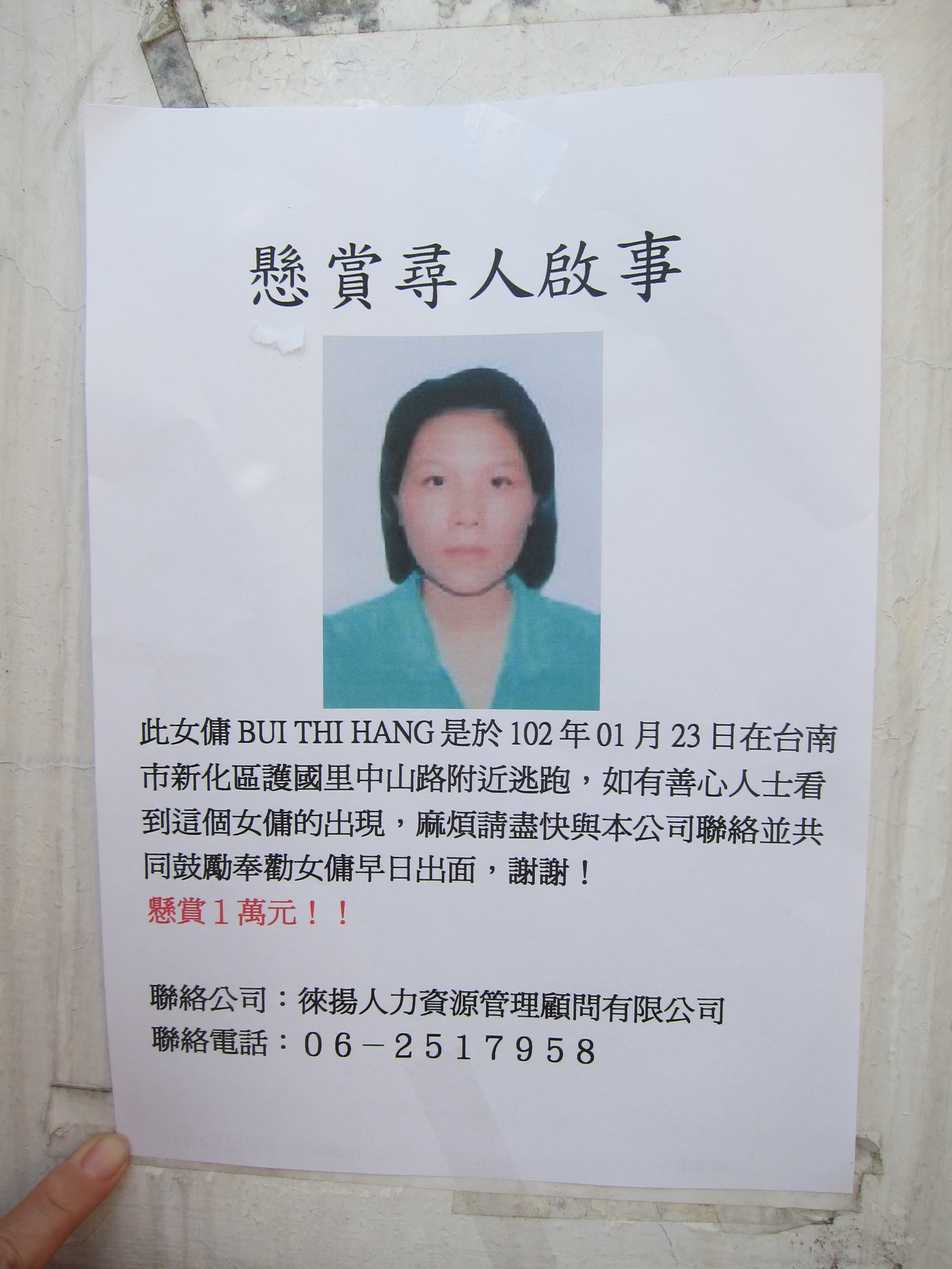 服務介紹 外籍移工逃逸懸賞資訊 外籍移工逃逸懸賞資訊 協尋逃逸外籍移工… 如果您發現下列移工行蹤,煩請儘速與勞動部檢舉。 非法移工專線:0800-000-978 或與本公司管理部(02)2273-5073聯絡。 SUNENGXXX 蘇寧X 151cm 52kg HASANUXXX 阿山 170cm 59kg MATSXXX 160cm 62kg UMI MUSLxxxx 莉卡 152cm 67kg SUMIYxxx 蘇咪 148cm 58kg RUMIYXXX 魯X 162cm 83kg MUNXXX 慕 154cm 48kg WARSXXX 瓦希X 170cm 55kg KOMARUXXX 寇X 175cm 61kg LI* 麗兒 155cm 53kg SINTA PURWITA **** 辛X 146cm 44kg WENIY*** 溫妮X 156cm 64kg IIS HERLxxx 莉X 153cm 50kg MAUL*** 毛X 0cm 0kg LU*** 露露 150cm 54kg RUSTI*** 0cm 0kg suy*** 152cm 46kg MUL** 170cm 60kg MU*** 慕X 147cm 57kg SITI KHOLI*** 西X 153cm 63kg KARXX 阿沙 169cm 65kg I*** 伊X 156cm 61kg DEWI KOMALAS*** 戴X 157cm 53kg ROHMAW*** 娃X 160cm 55kg NURHAYATI BT AMIR PA*** 148cm 61kg SULA*** 152cm 49kg R*** 麗X 155cm 47kg HART*** 156cm 47kg YENI PUJI*** 歐X 152cm 57kg MUSRIN*** 摩思X 152cm 57kg DWI SUCI RAMADH*** 阿X 150cm 56kg WIWI ADE YA*** 安X 146cm 54kg MUNCUL SUGIA*** 阿X 158cm 75kg RERI JUWITAS*** 莎X 150cm 51kg NGAT*** 娣X 150cm 68kg NURLATI*** 阿X 167cm 72kg PHAM THI D*** 范X容 159cm 56kg YAMINAH AGUS*** 雅X 156cm 55kg WIDIA FITRI*** 葳X 156cm 43kg BIKROTUN NADHI*** 娜X華 155cm 65kg LILIK SUMARY*** 莉X 158cm 61kg MISHAY*** 雅X 154cm 59kg CICI MUSPITAS*** 吉X 157cm 56kg ANGGILINA SAFI*** 莉X 159cm 69kg AN*** 安X 152cm 52kg NGUYEN XXX TAI 阮X才 162cm 51kg BUI THI XXXX 裴氏X 155cm 52kg NGUYEN XXX KHUYEN 阮X圈 170cm 68kg PHAM VAN XXXXX 范文X 165cm 55kg NGUYEN XXX NGA 阮X娥 155cm 45kg NGUYEN XXX VIEN 阮X遠 156cm 50kg TRAN XXX TUYEN 陳X線 175cm 62kg DUONG XXX TUAN 楊X俊 175cm 58kg TRAN XXX LINH 陳X玲 167cm 62kg DO VAN XXXX 杜文X 175cm 65kg NGO XXX SANH 吳X策 167cm 62kg NGUYEN XXX HUNG 阮X雄 170cm 62kg LE XXXX HUY 黎X輝 170cm 57kg NGUYEN XXX MAI 阮X梅 156cm 42kg VU XXX LAN PHUONG 武X蘭芳 154cm 53kg LUONG THI *** 梁氏X 152cm 56kg VU VAN T*** 武文X 160cm 53kg NGUYEN DUY ***** 阮維X 0cm 0kg NGUYEN VAN ***** 阮文X 0cm 0kg NGUYEN *** GIA 阮X價 161cm 53kg NGUYEN THI *** 阮氏X 0cm 0kg PHAN XUAN ***** 潘春X 0cm 0kg NGUYEN THI PHU*** 阮氏X 151cm 53kg TRAN VAN V*** 陳X園 170cm 70kg LUONG THI *** 梁X雲 152cm 56kg NGUYEN TRUNG T*** 阮忠X 157cm 54kg CHU THI *** 朱氏X 154cm 48kg LE BA *** 黎伯X 172cm 61kg DUONG THI H*** 楊氏X 159cm 67kg NGUYEN DUY *** 阮唯X 170cm 61kg TRUONG THI *** 張X六 160cm 52kg PHAM THI *** 范X荷 150cm 50kg VU VAN T*** 武X全 160cm 53kg TRUONG ANH TU*** 張X雪 145cm 45kg NGUYEN THI ** 阮X霞 155cm 60kg PHAM THI D*** 范X蓉 150cm 50kg NGAN VAN T*** 銀X全 168cm 63kg DO VAN *** 杜X壽 167cm 60kg HO NGOC ** 胡X何 156cm 49kg MAL*** 153cm 40kg TAN** 吉內X 153cm 55kg UCOL HELEN SALVA*** 海X 153cm 53kg ALQUIZALAS GEMMA RICAF*** 潔X 161cm 57kg 共計 0 項