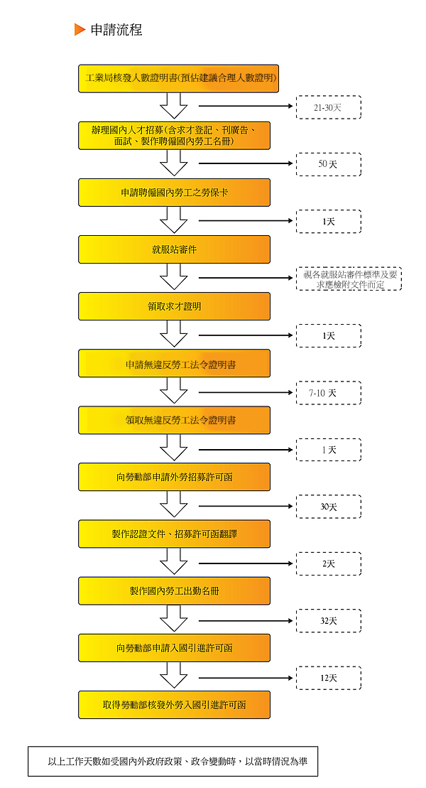 - 行政院勞委會業於98年3月7日起停止受理製造業「特殊時程」申請引進移工案件。